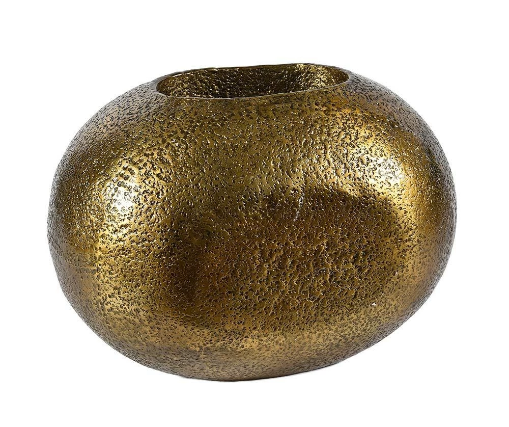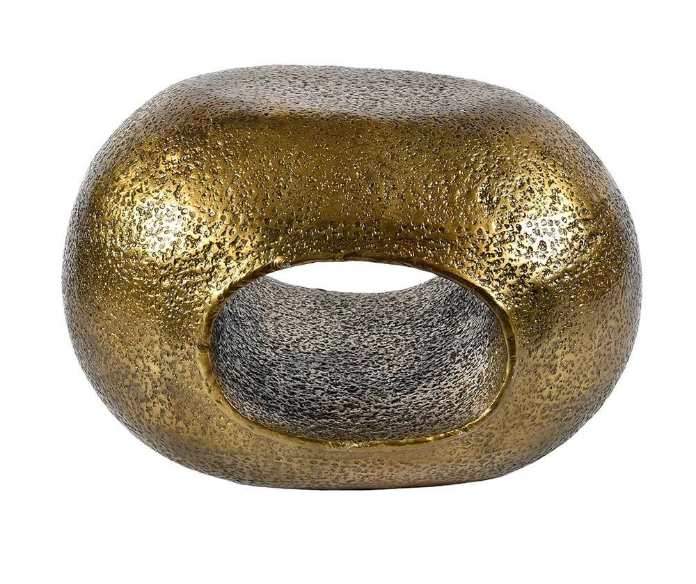 Stolik wykonany z aluminium, w kolorze ciemno złotym. Wykonany ręcznie. Posiada obły kształt z otworem, który idealnie nadaje się jako wnęka na gazety, koce a nawet dla kota lub małego psa.