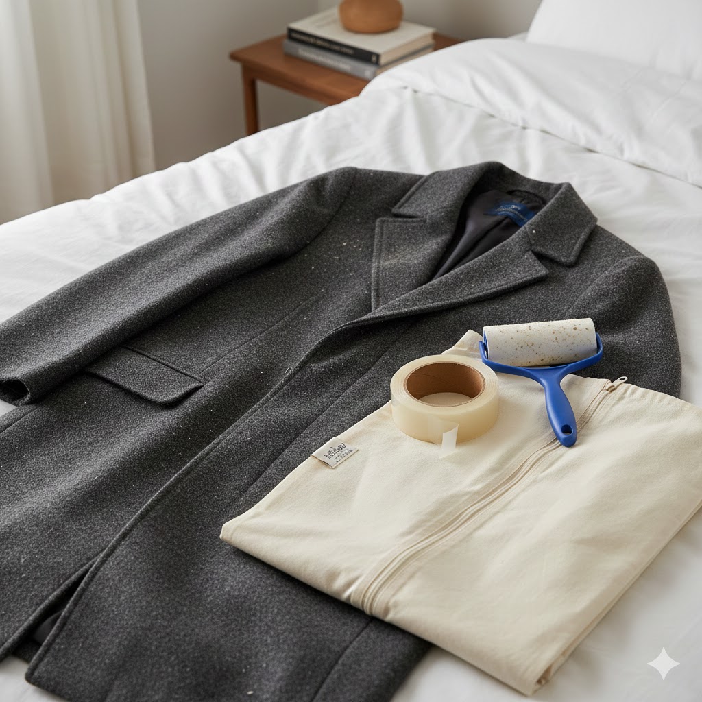 Płaszcz wiszący luzem w szafie bardzo łatwo zbiera kurz i włókna z innych ubrań. Potem „wynosi” je na zewnątrz przy pierwszym założeniu.